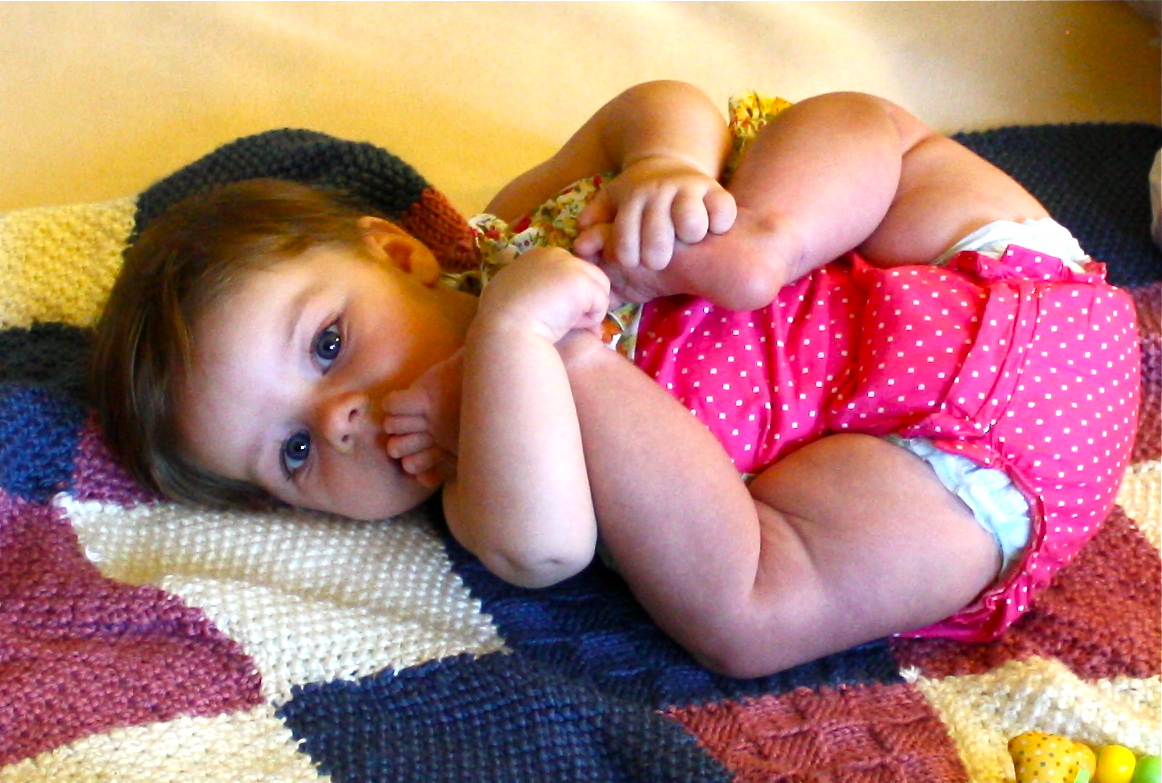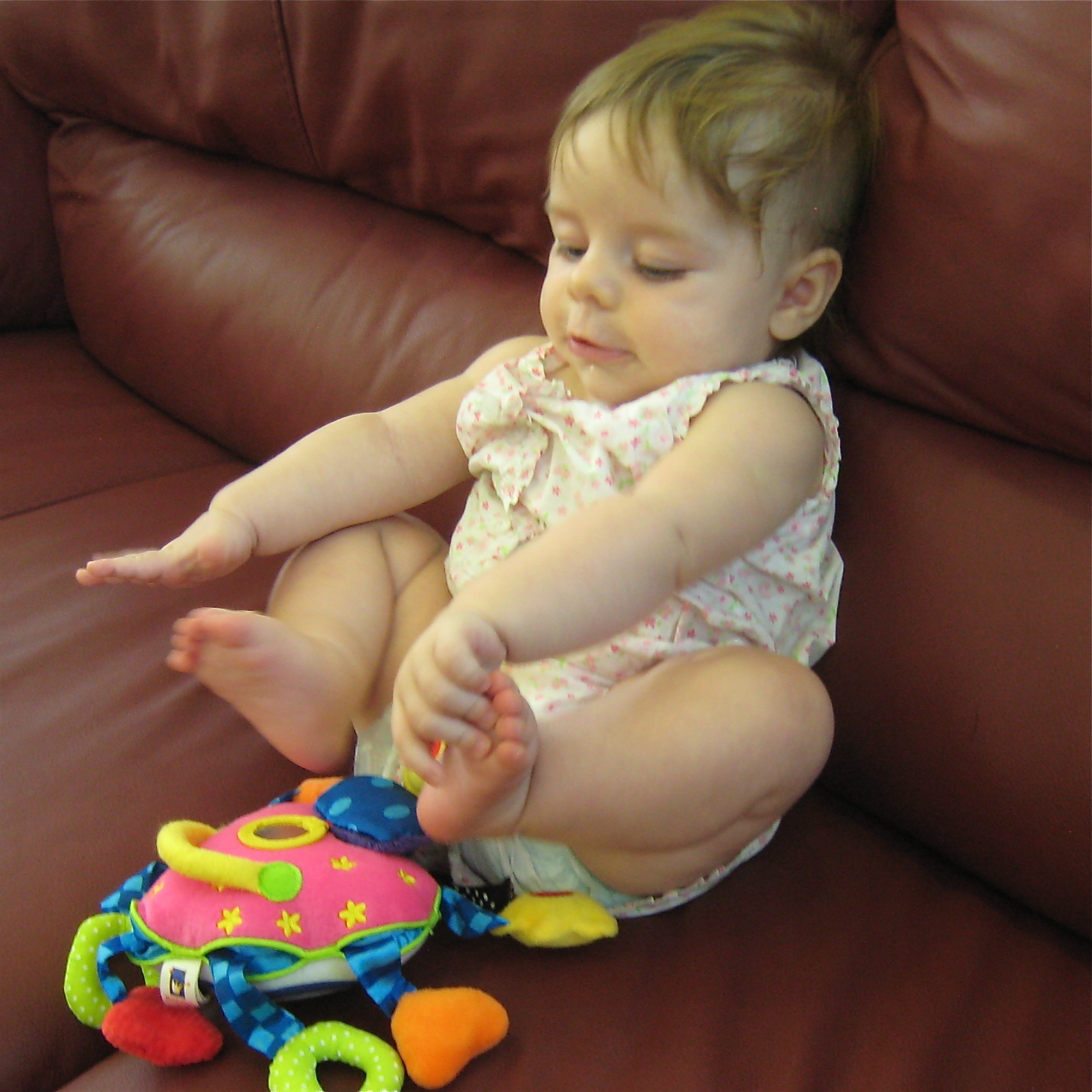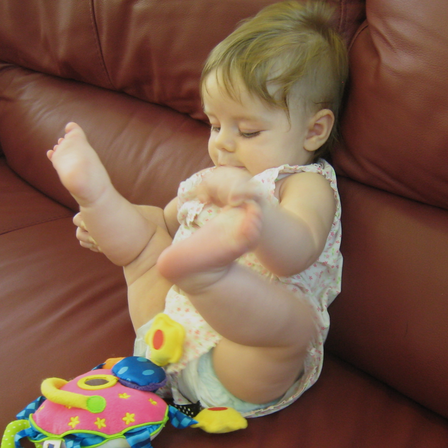 But anyway, Lena’s not obsessed with sitting up. Not yet. Right now her obsession is her feet. She can reach them. And they taste good. Mmmm…