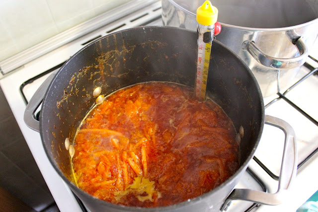 And into the pot they went, along with quite a bit of sugar and the orange-flavored water that had been boiling with the orange skins.