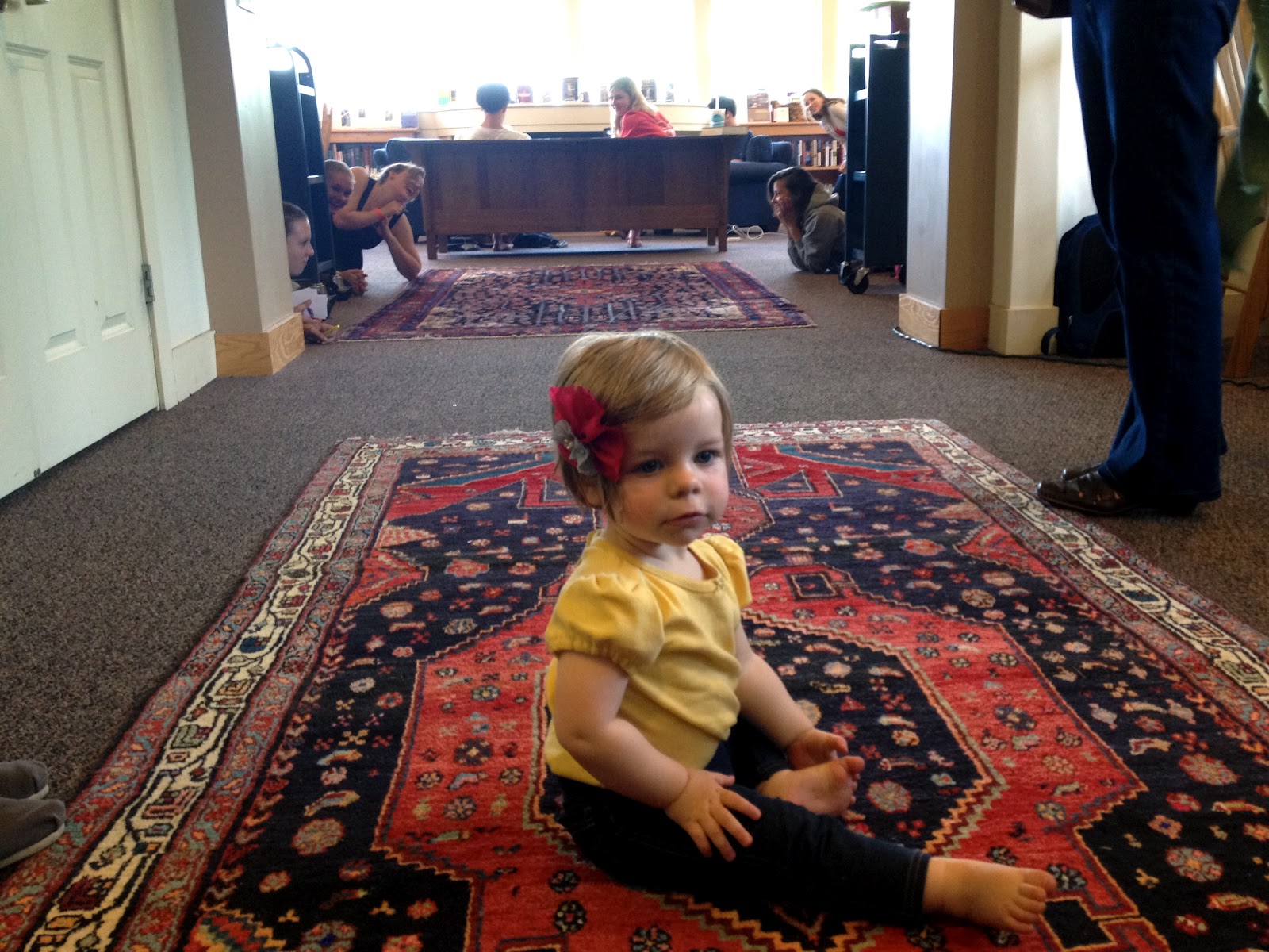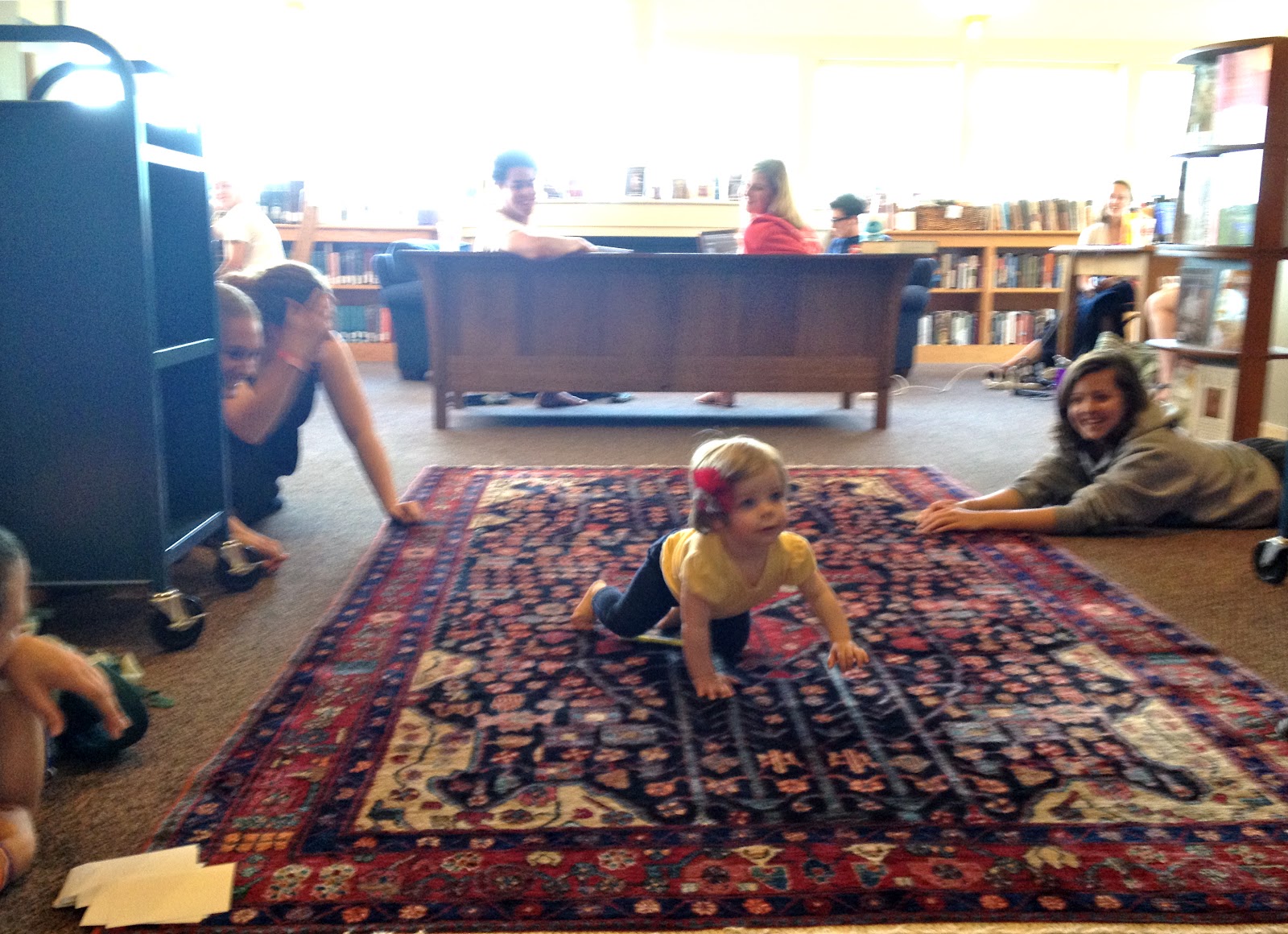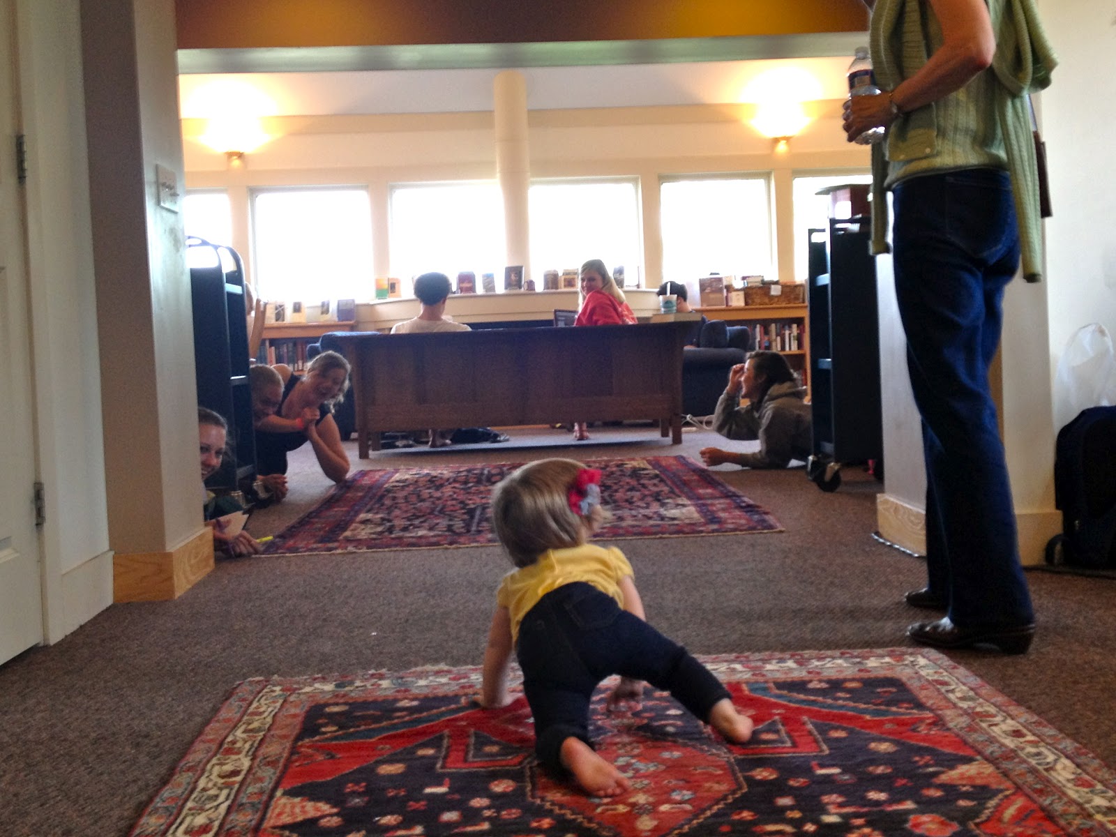 And she was a total hit! Look at this series of photos as one by one the students pop out of the carrels to admire the cute little baby. She was totally hamming it up, taking one girl’s highlighter and then waving it around, putting it behind her head, babbling, bouncing up and down in the middle of the floor. The whole room was giggling helplessly, including her mama.