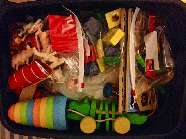 I looked at the present Lena had just opened and the pile of presents to be opened tomorrow over the next several days and agreed with him. I dumped out her toy basket and removed everything except a relatively new alphabet puzzle and the gift she had just opened. Everything else went into her toy library bin. Many of the smaller items had to be organized into Ziploc bags.