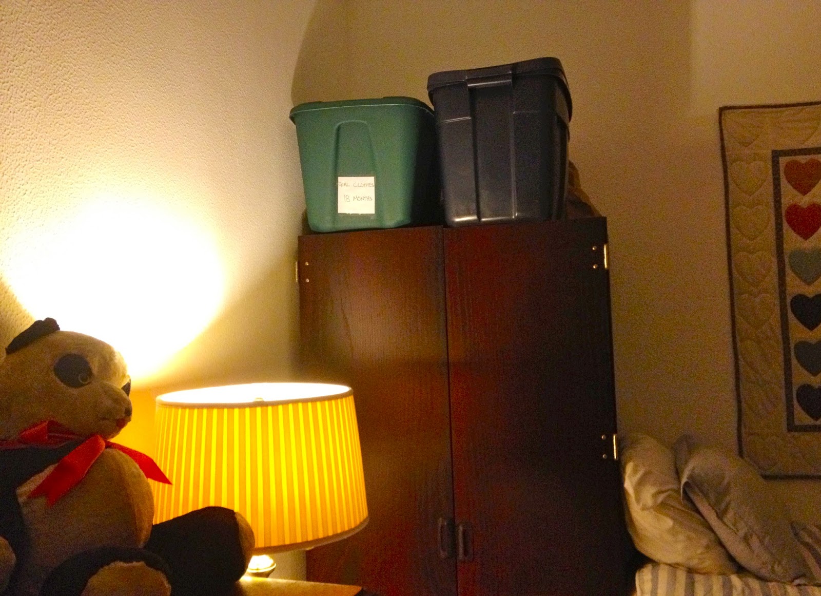 The blue bin went back up on her closet, to be taken down again in a couple weeks, when Christmas toys will be put away and old favorites will be pulled out again.