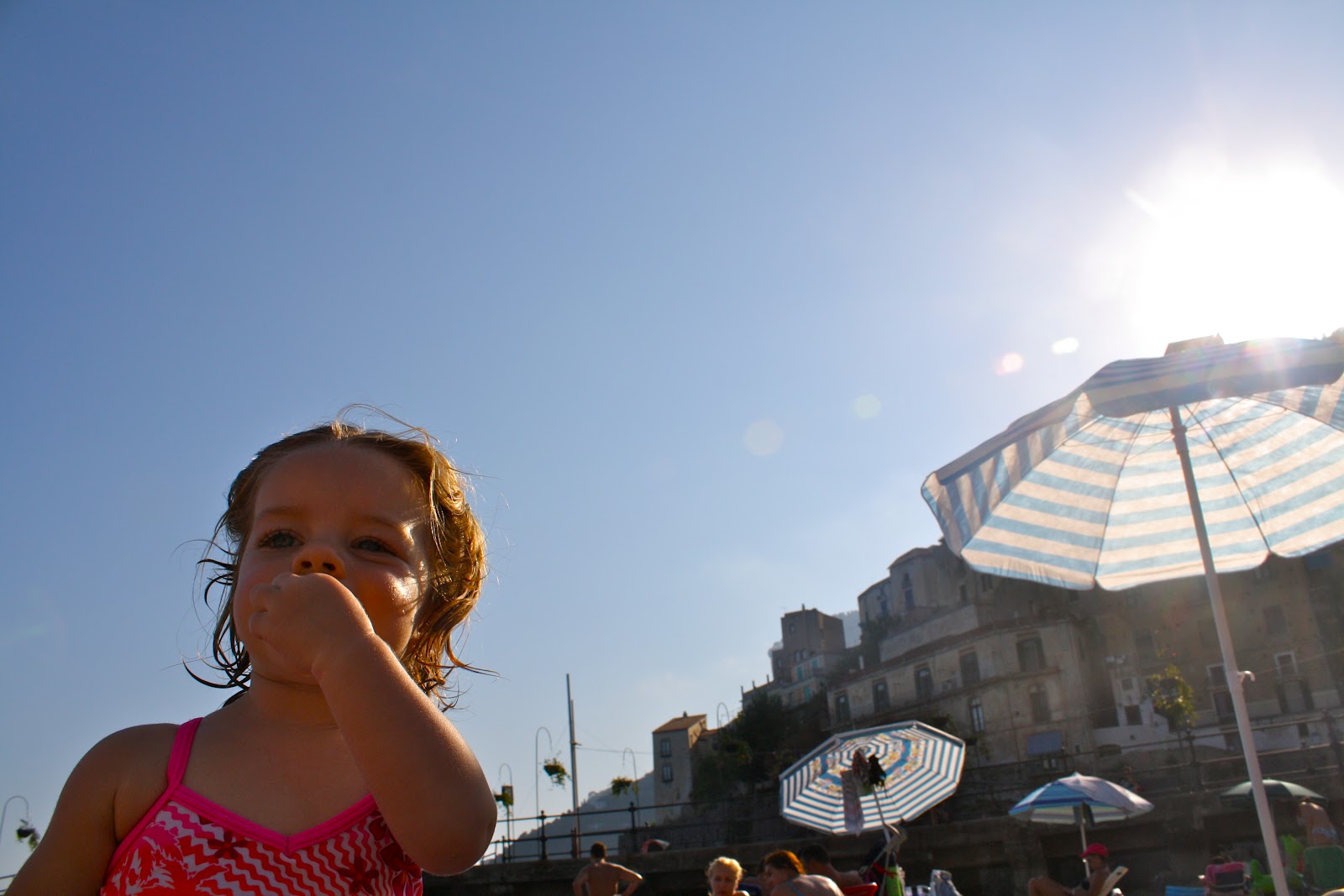 That afternoon we went to the beach below our apartment. August is the holiday month in Italy and so the free beach (the one where you didn’t have to pay for a lounge chair and umbrella) was crowded with adults and children of all ages. We found a little patch of ground on which to put our towels and soaked up the sun.