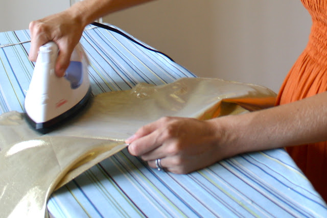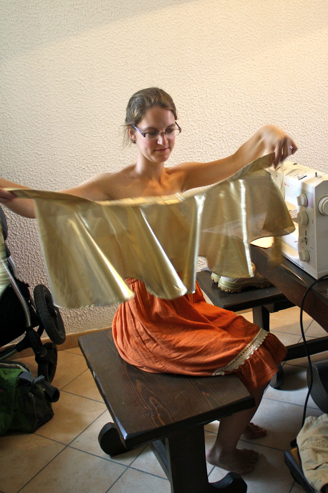Now the question remained: could I make her a dress from this piece of fabric?? I stared at the fabric and then studied photos of Dorothy, and very quickly the whole idea came together. I pulled out my sewing machine and shears, cut up the fabric into a few simple rectangles, and started sewing everything together. In a couple of hours I was able to craft something that fit her, even despite the fact that the only thing she wanted to do with the measuring tape was put it around her neck.