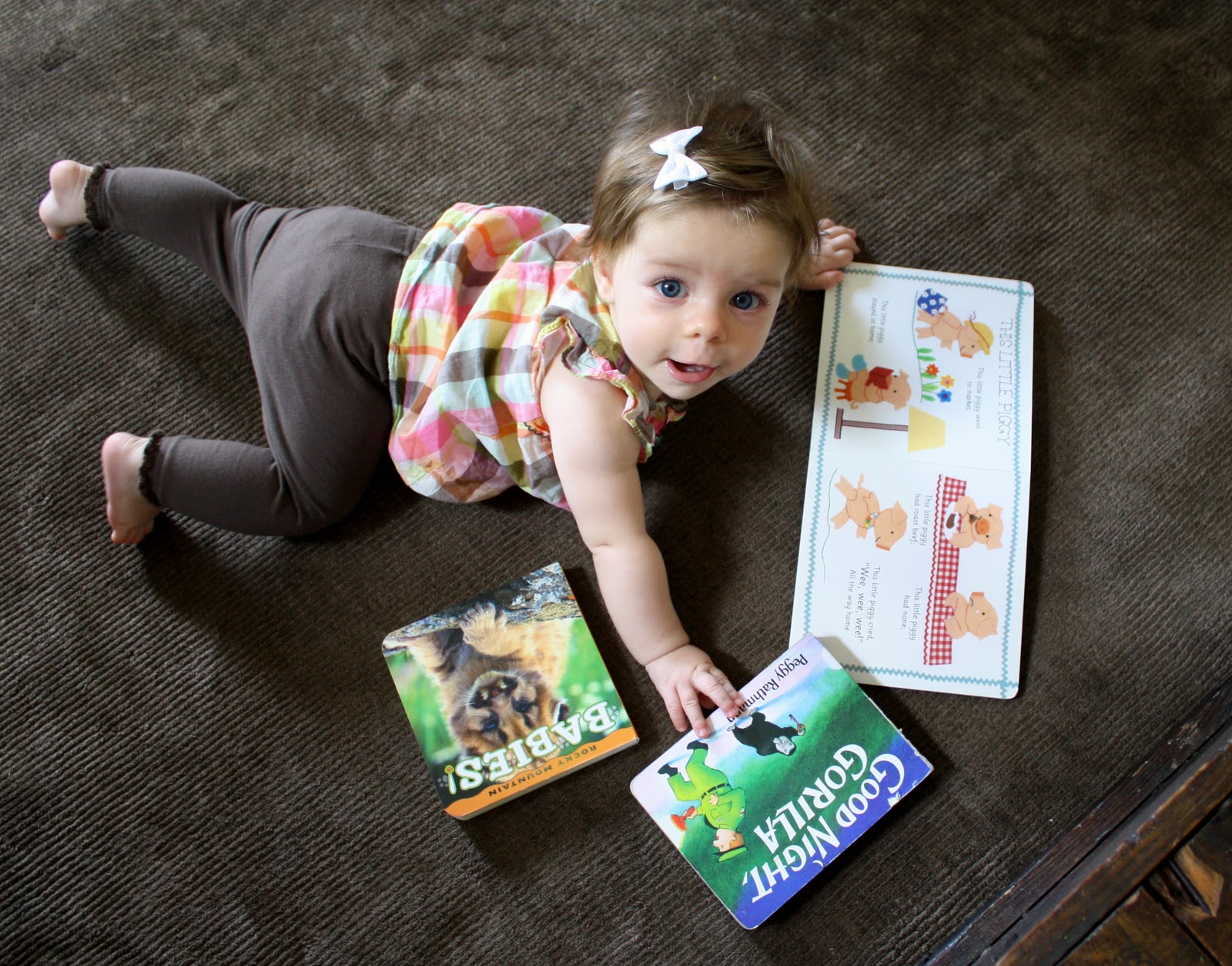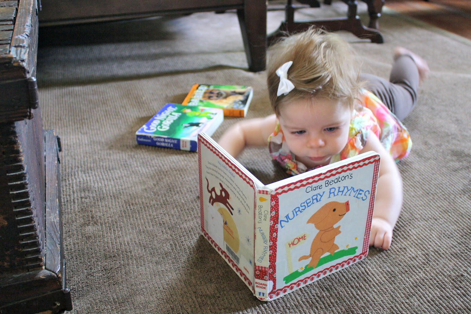 I don’t know why, but my comments sometimes don’t show up here. Second attempt: love the reading picture quickly followed by rug fascination. :) Such a smart girl…