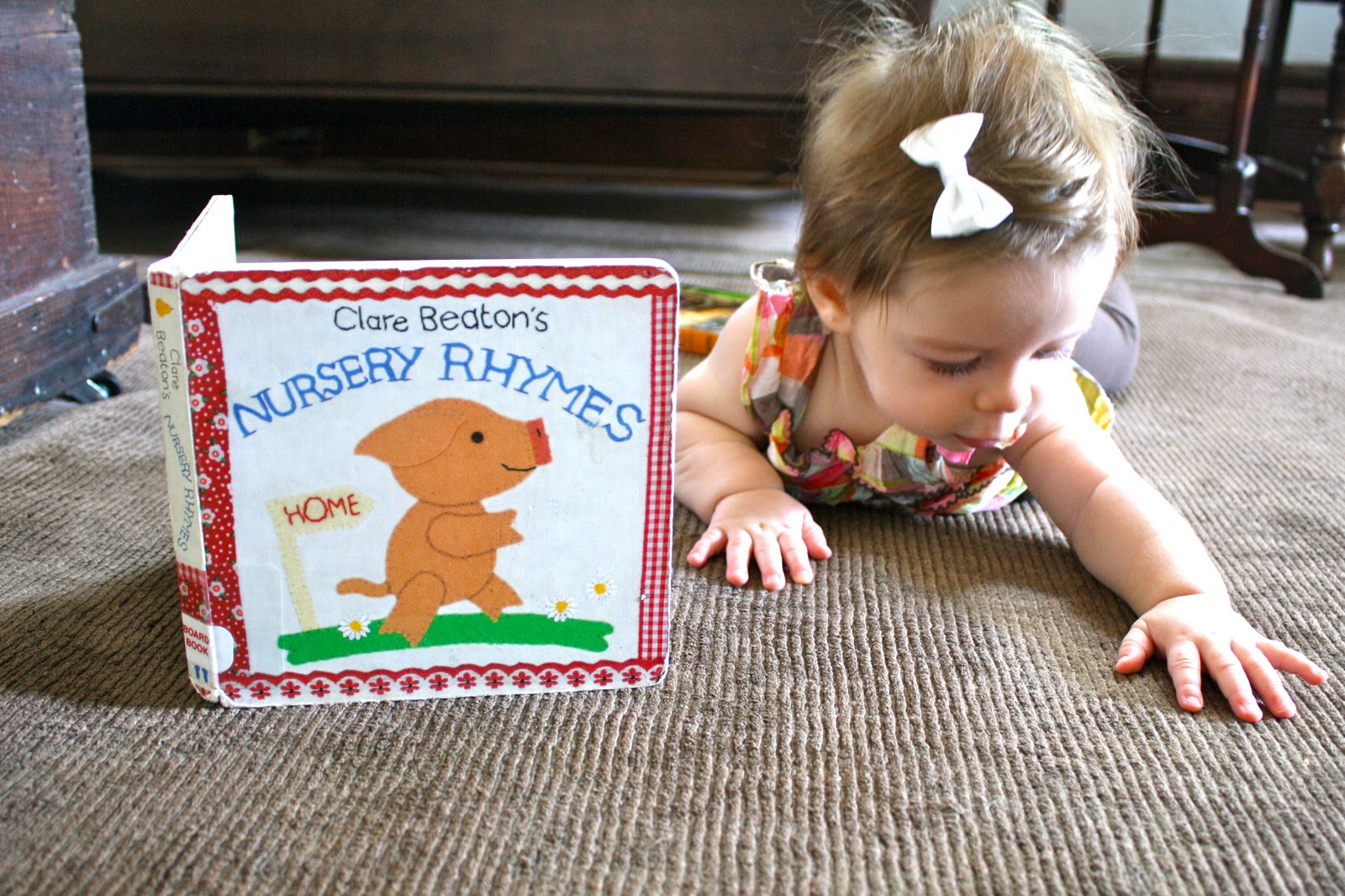 She got distracted by the amazing rug and started rubbing her hands over it.  End book time, begin texture time.