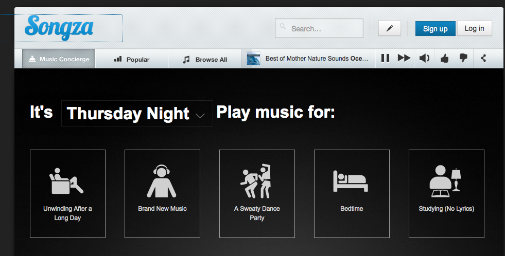 Here is what Songza looks like now, on Thursday night, while I am writing this post: