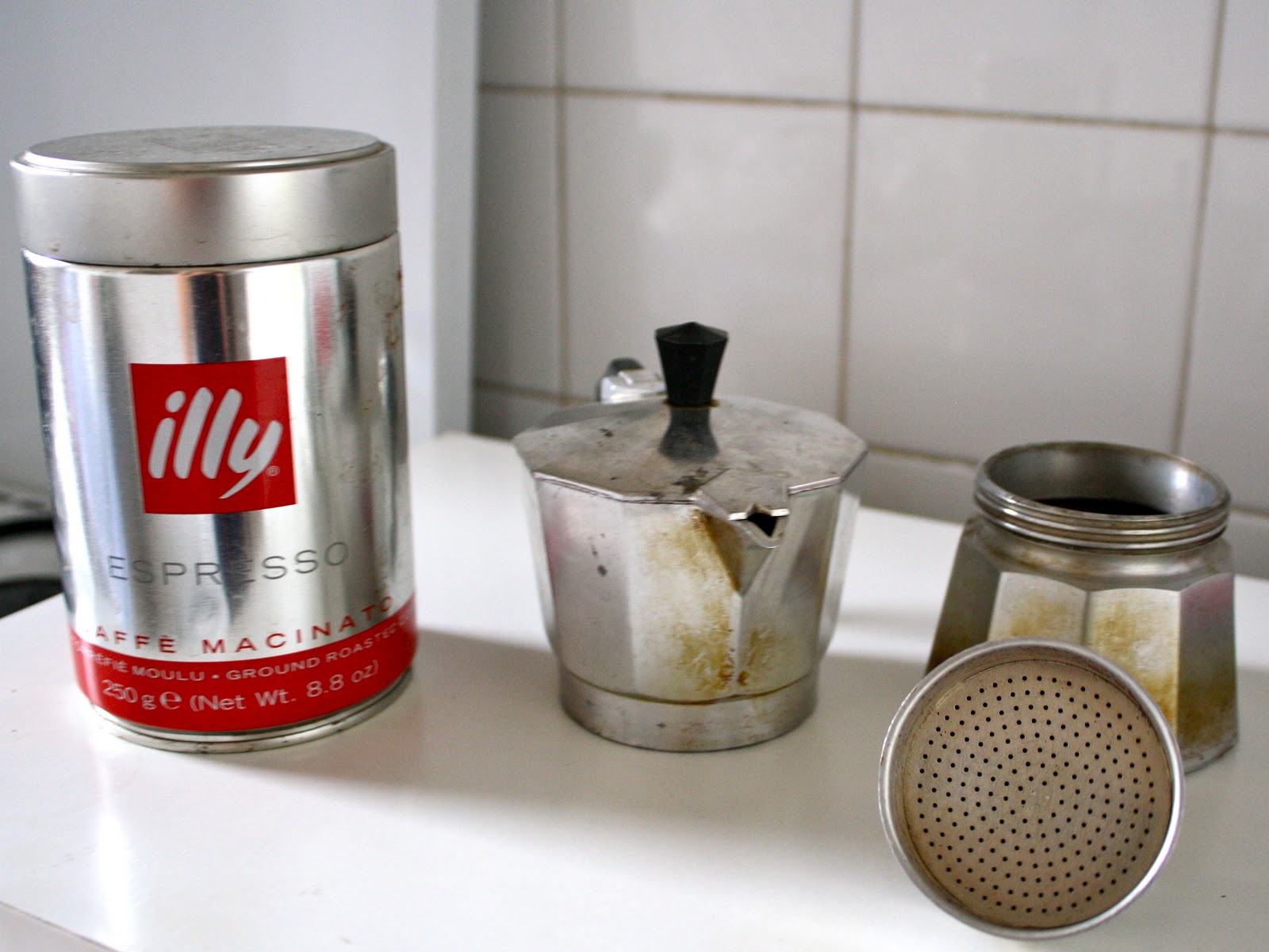 A little tutorial on coffee-making, Italian-American style. Begin with your supplies: ground coffee and your moka pot.