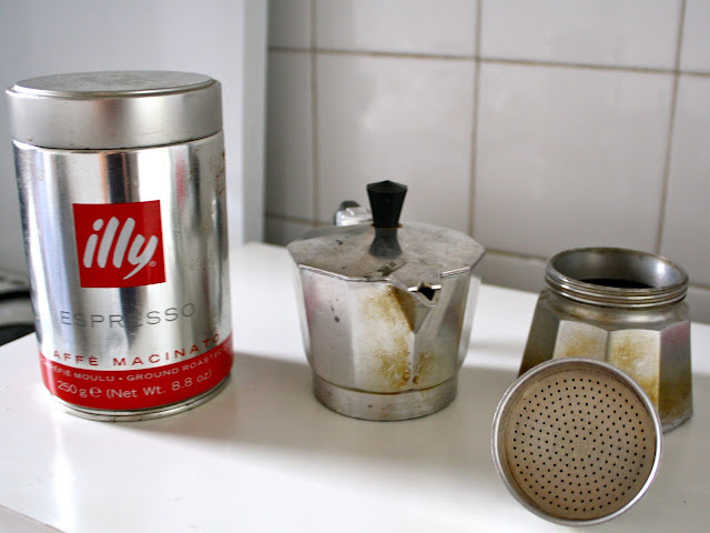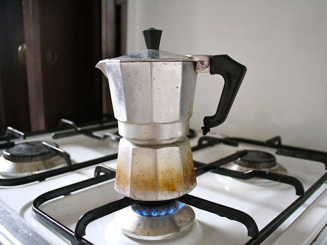 The psychotherapist who owns the studio had three espresso pots (moka pots, or macchinetta) on top of his refrigerator. We put those little pots to good use that rainy morning.