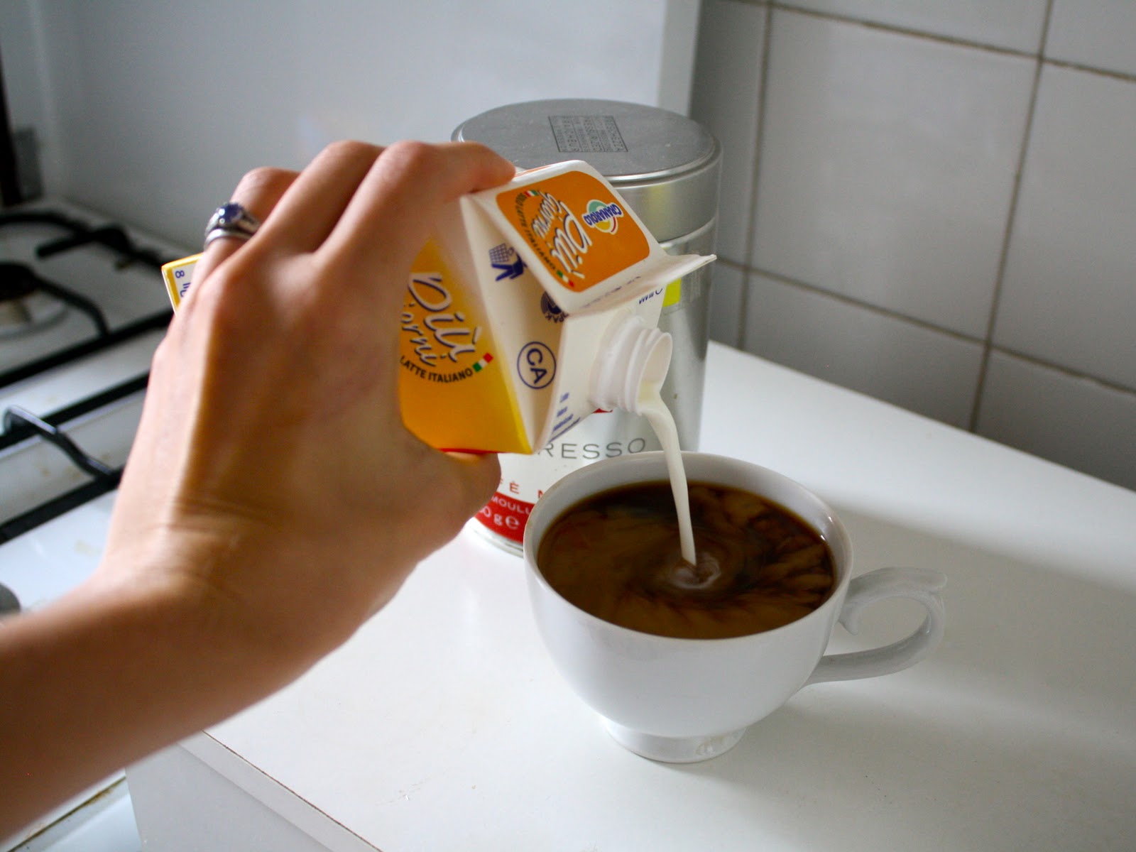Pour your fresh coffee into a teacup.