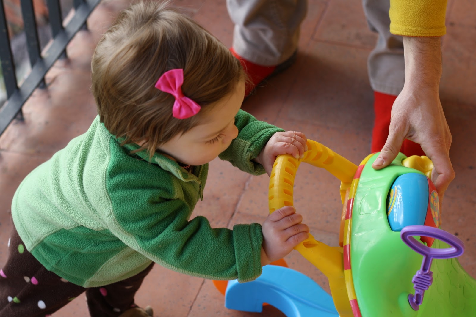 She is learning to walk with her little walker, pushing it up and down our balcony and crashing into things every 5 seconds.  It makes me think she’ll take after my driving skills instead of her papa’s…