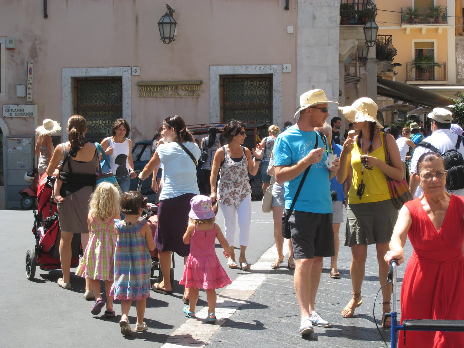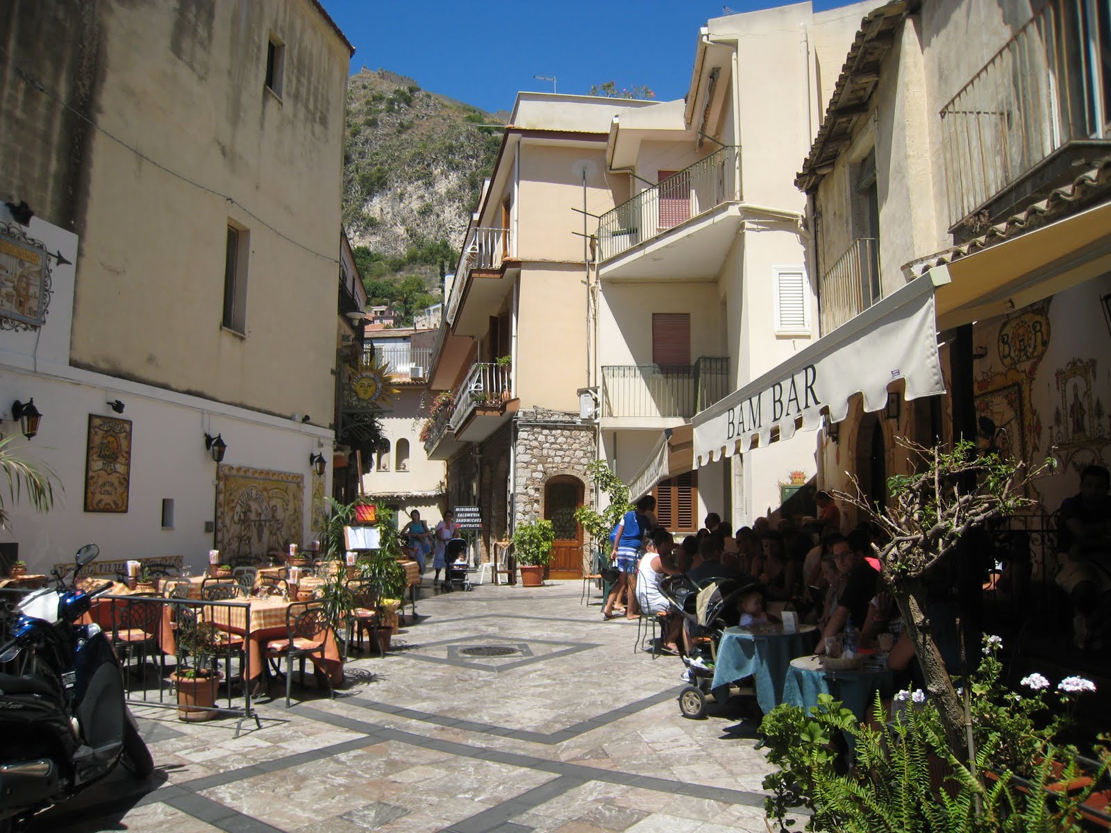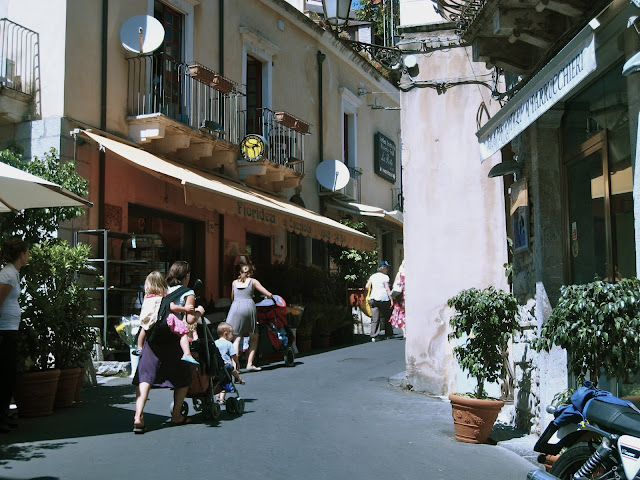Taormina wound its way before us: one sunny piazza after another filled with cafes and gift shops, twisting streets bustling with tourists, and Italians in trucks and motorbikes zipping through it all.