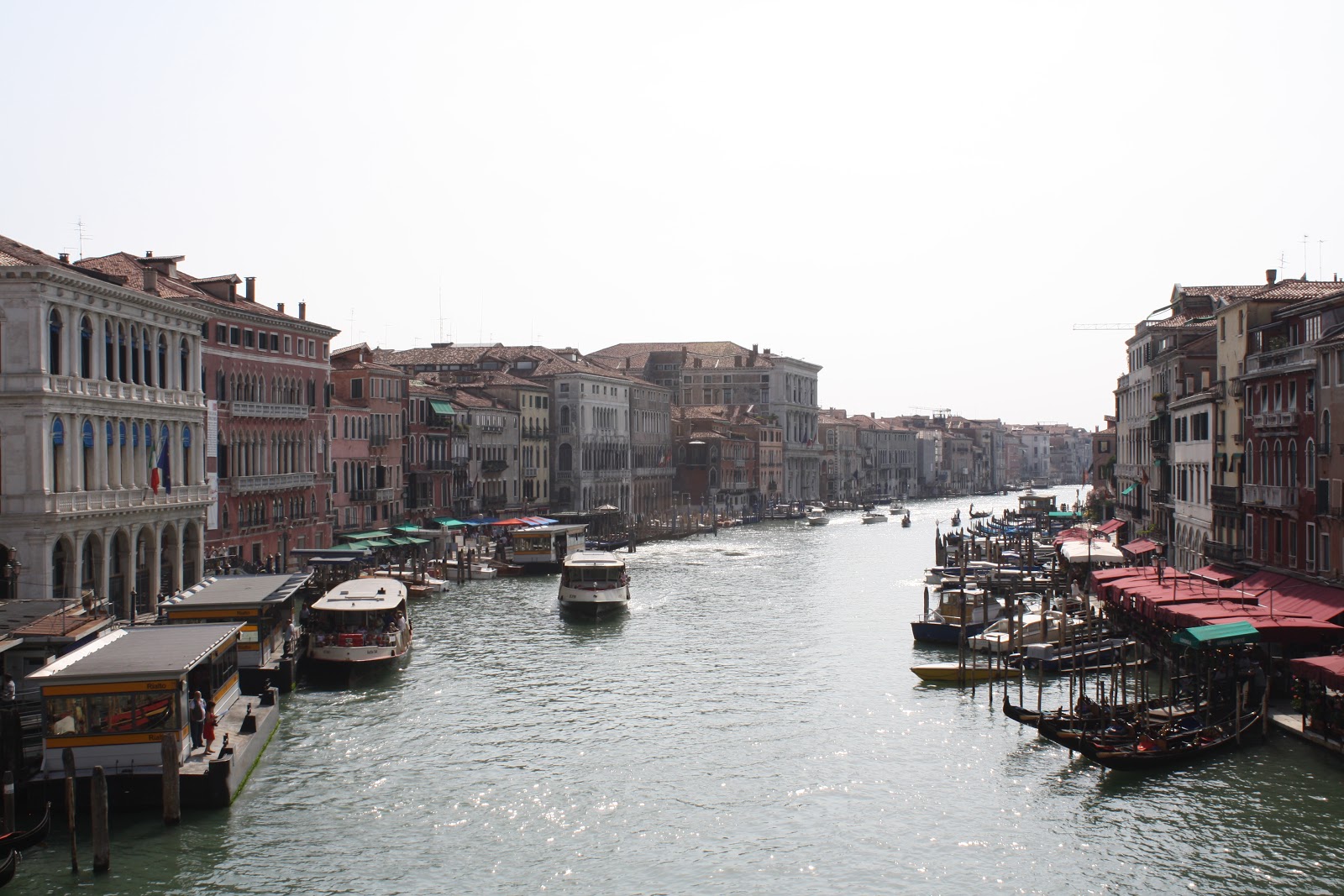 … and out to the Grand Canal, with the famous Rialto Bridge in sight.