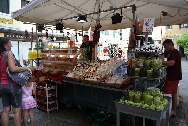 A common sight in Venice.  The pink wine bottles on ice are Bellini, a local drink made from prosecco and peach juice.  Mmmm!