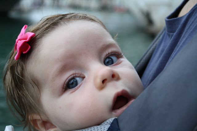 Lena is ready to eat real food. Elliott offered her a taste of his peach a little while back, and now when she sees us eating peaches and nectarines (of which we eat about 3 apiece these days) she reaches for it and sucks on it. Rice cereal–the standard first food for babies–is going to be such a let down after sweet peaches!